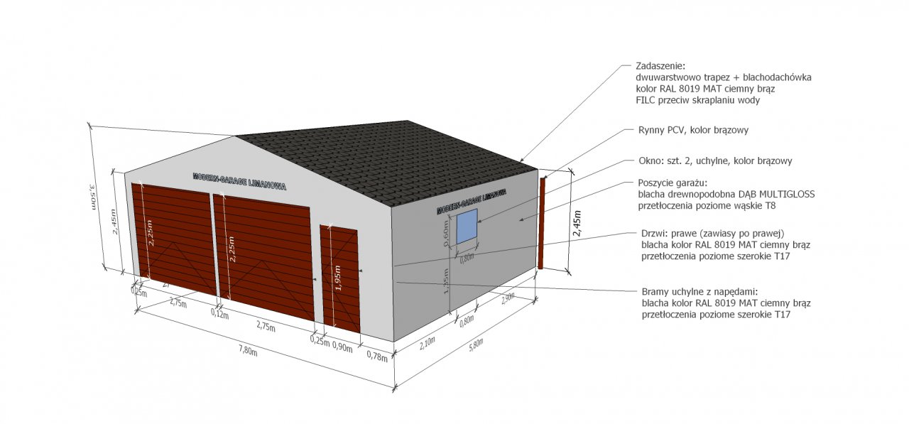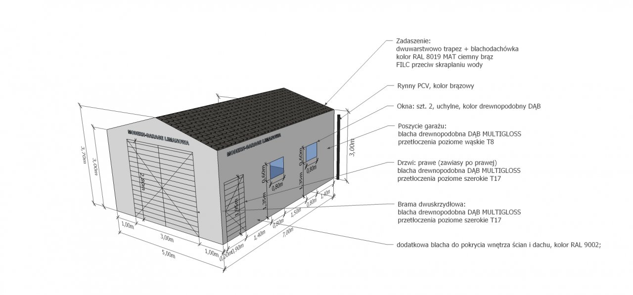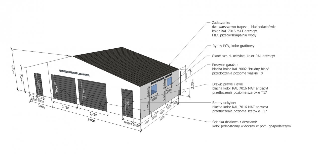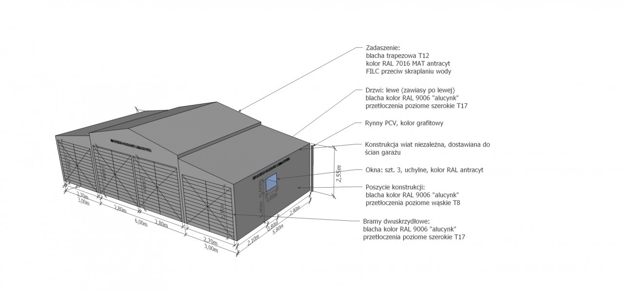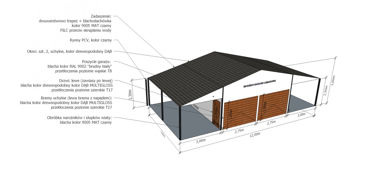 - zadaszenie: dach dwuspadowy/jednospadowy, blacha trapezowa/blachodachówka kolor RAL wg dostępnej palety;