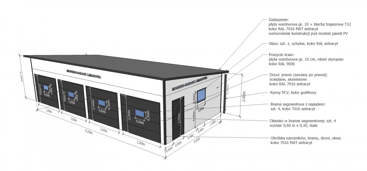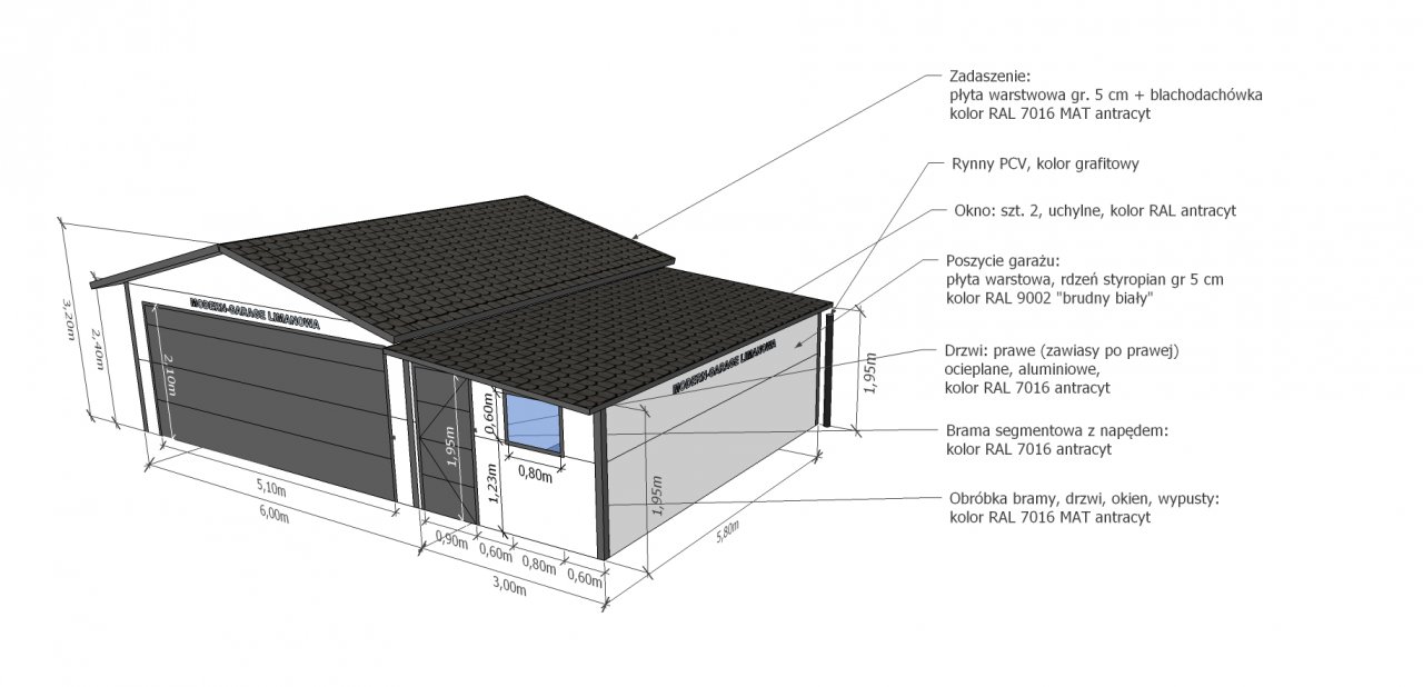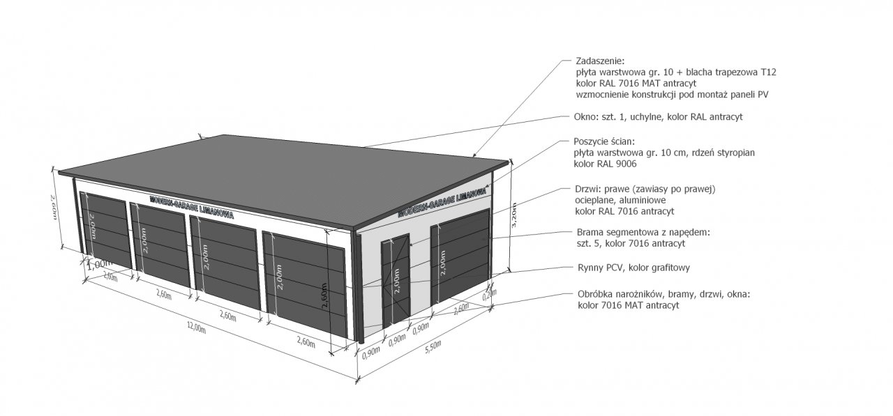 - zadaszenie: dach dwuspadowy; poszycie dachu: płyta warstwowa z rdzeniem z piany poliuretanowej (PiR) 60 mm/100 mm lub z rdzeniem styropianowym 50 mm/100 mm, pokrycie: blachodachówka/blacha trapezowa; kolorystyka wg dostępnej palety RAL;